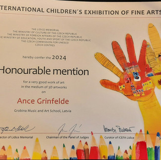 Skolēnu brīvlaikā GMMS audzēkne Tīna Bliska un skolas absolvente Ance Grīnfelde devās uz Jūrmalas mākslas skolu, lai saņemtu 52. Starptautiskās bērnu mākslas izstādes-konkursa "Lidice 2024" laureātu apbalvojumus.